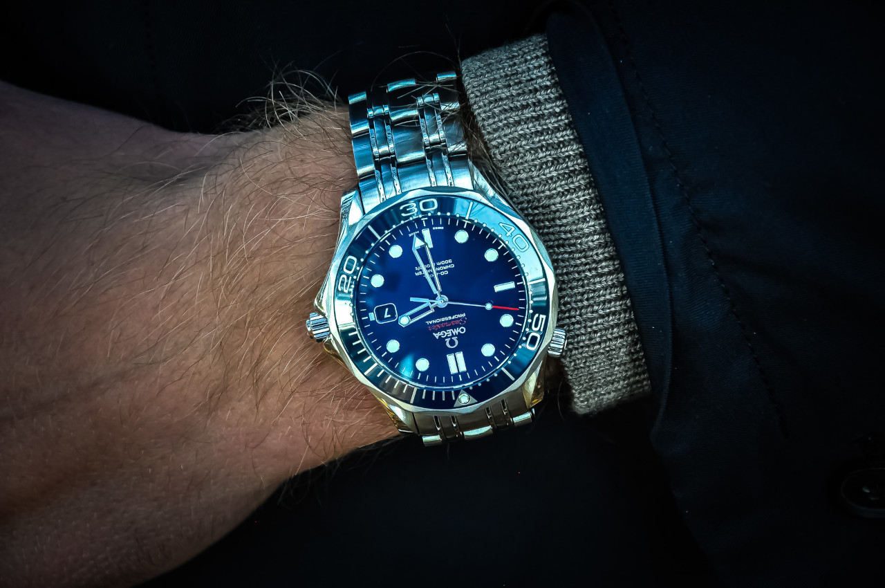 Mycket av den här bärbarheten kan tillskrivas klockans smala boett och den ledade 5-länkdesignen på Bond-armbandet. Oavsett om du älskar eller hatar det, är armbandet direkt hämtat från filmen Golden Eye från 1995. Som en hängiven Bond-fan räknar jag detta som ännu ett plus. Om armbandsdesignen inte faller dig i smaken ser klockan lika bra ut på olika NATO- eller gummiband. I avvikelse från den ursprungliga Bond Seamastern (2541.80 quartz) har SMPc lämnat den vågiga tavlan för en mer modern och glansig lackad urtavla. Klockan har gott om närvaro på handleden, med den djupa blåa urtavlan och den reptåliga keramiska bezeln. Att säga att SMPc är fotogenisk är en underdrift, eftersom den glansiga urtavla/ram-kombinationen fångar ljuset på ett fantastiskt sätt. Även om denna specifika Seamaster inte längre är tillgänglig som ny från återförsäljare rekommenderar jag starkt att söka efter en egen på begagnadmarknaden. Den våglösa Omega Seamastern träffar den perfekta balansen i en modern sportklocka.